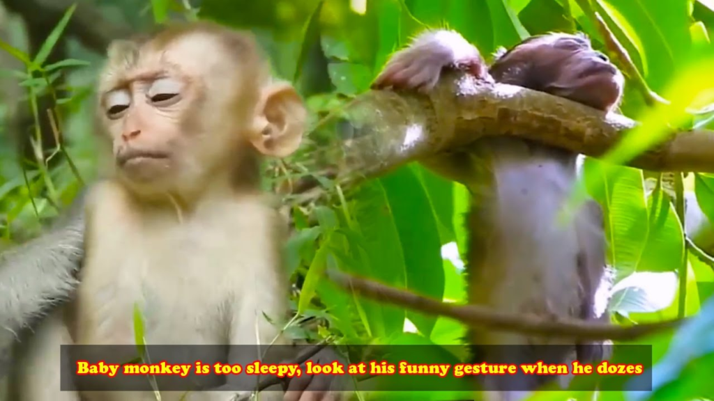 The jungle grows quiet. Soft sunlight filters through the leaves. In this adorable wildlife moment, baby monkey is too sleepy, look at his funny gesture when he dozes, creating a scene that instantly melts hearts.