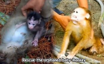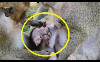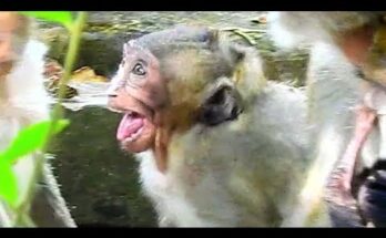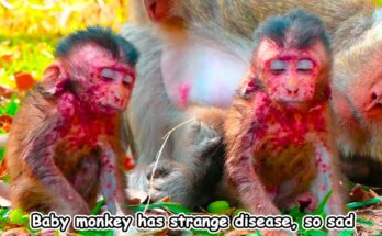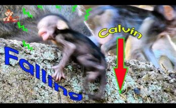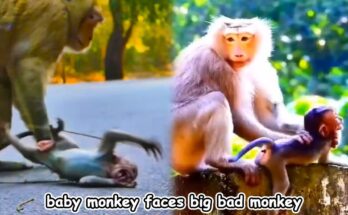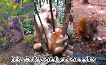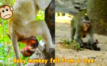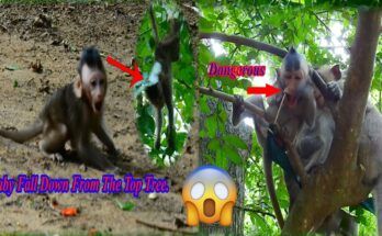 A sudden cry shattered the calm forest air. Leaves rustled violently.The baby monkey suddenly fell from the tree, triggering immediate panic in the troop. The tiny baby monkey had been …