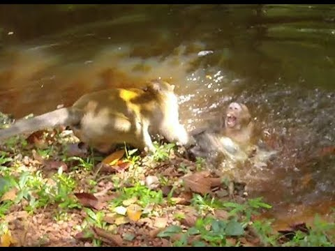 Furious leader monkey angry bite & fight mom monkey fall into water mom monkey so scare