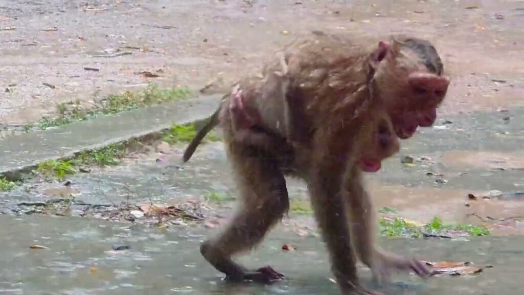 Leo’s small body curled inward, his fragile arms unable to shield himself from the heavy drops. Each second felt heavier than the last. His cries, barely audible over the pounding rain, reflected pure vulnerability — a moment that echoed scenes described in our coverage of infant monkeys facing environmental danger.