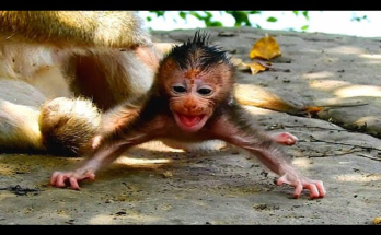 Tiny baby Emoly clung weakly to the edge of a low branch, her small body trembling under the weight of fear and uncertainty. Her mother was nowhere in sight. The world around her felt too big, too dangerous, and far too cold for someone so new to life.