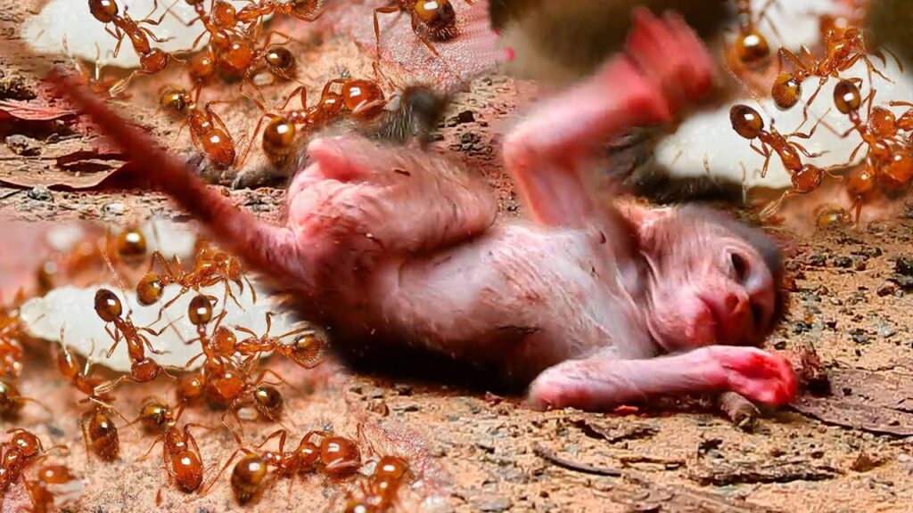 A nearby monkey suddenly noticed the chaos and rushed toward the suffering infant. In a desperate moment of instinct and compassion, the ants were brushed away one by one, giving Tilly a fragile chance to breathe again.