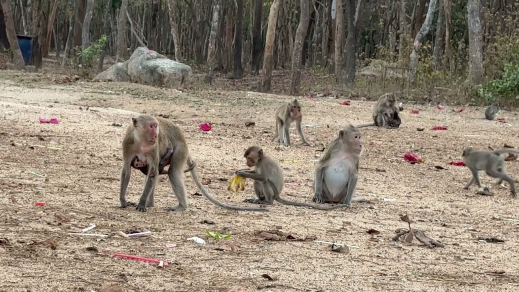 One by one, the monkeys rush in with curious eyes and quick little hands. Some grab their share and run, while others stay close, creating a lively scene full of energy and surprise.