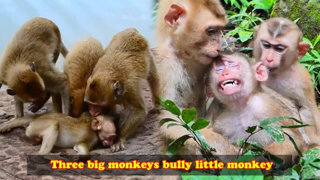 Three big monkeys bully little monkeys. The little monkey could only lie still and endure