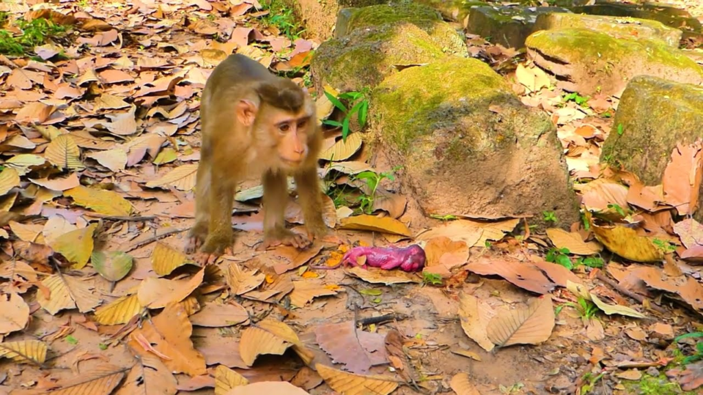 Lily and her brother Leo slowly approached, their eyes filled with curiosity and caution. The baby monkey newborn seemed weak, barely moving, creating a moment of silent tension in the group.