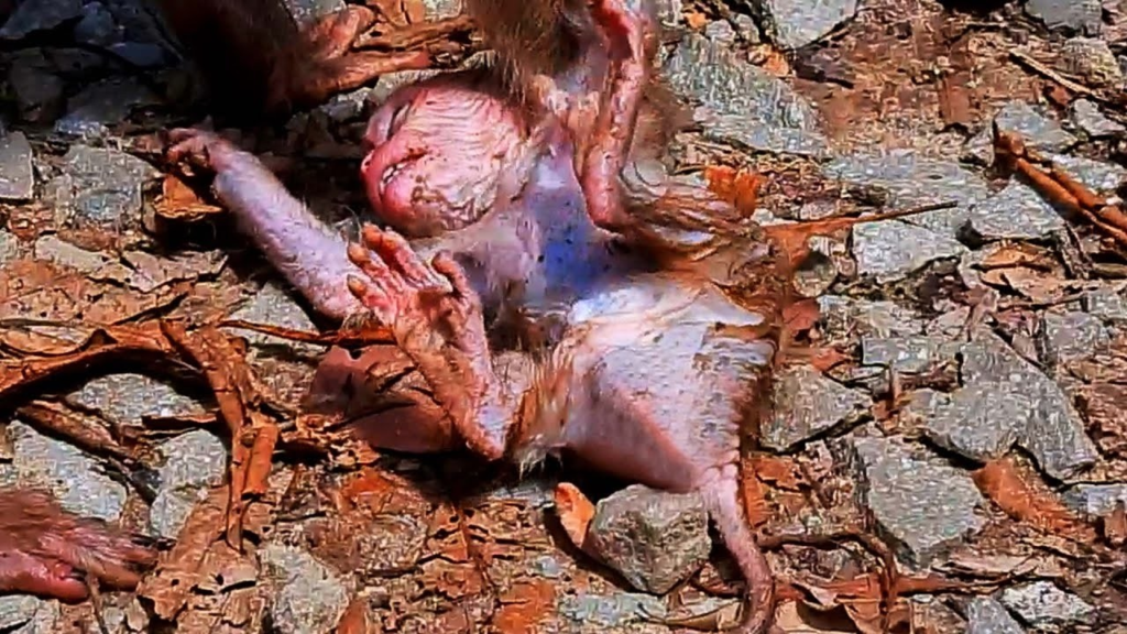 A forceful grab. A sharp reaction. The monkey is pulled, its fragile body struggling to keep up. The cries grow louder… then weaker as the situation spirals out of control.