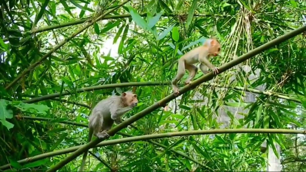 The baby monkey is still young and fragile. Every jump looks difficult, every step uncertain. As the troop moves deeper into unfamiliar territory, the little one struggles to keep up, occasionally pausing with tired eyes while its mother waits nearby.