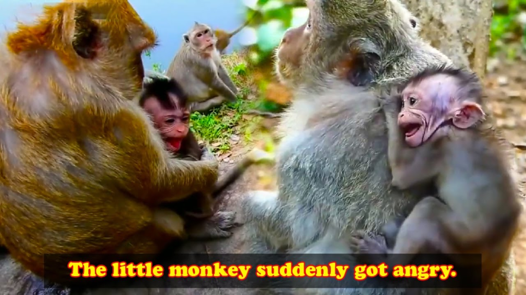 Suddenly the little monkey got angry and screamed, what happened to it? The peaceful moment quickly turned tense as the little monkey began shouting loudly, its small body trembling with emotion while the surrounding troop watched with curiosity.