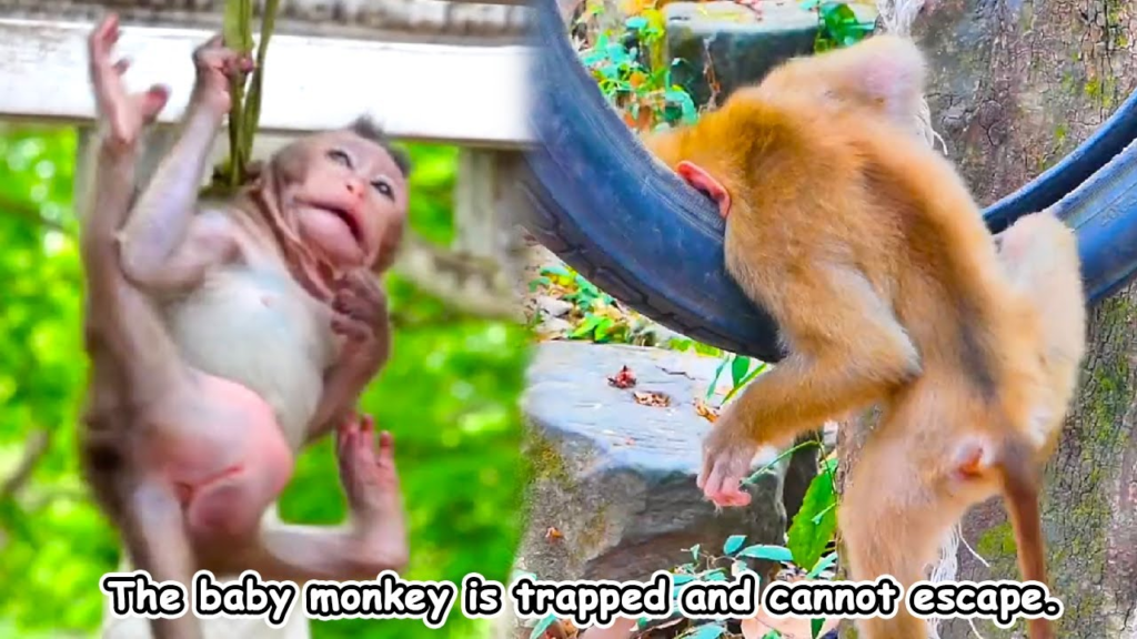 The baby monkey squealed in fear, its tiny hands reaching upward. Nearby leaves shook as the mother rushed back and forth, desperately searching for a way to free her child. The tension grew heavier with every passing second.
