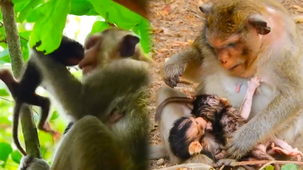 In this rare wildlife scene, the mother monkey has two baby monkeys but the mother monkey discriminates against her baby, creating a heartbreaking moment in the fragile world of primates. While both infants search for warmth and protection, only one baby seems to receive the mother’s attention.