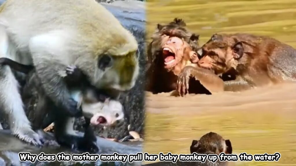 The mother monkey lunged forward, her movements fierce and urgent. To outsiders, it looked like anger. She seized the baby monkey roughly, pulling it from the water with startling force. The infant cried loudly, clinging to her soaked chest.