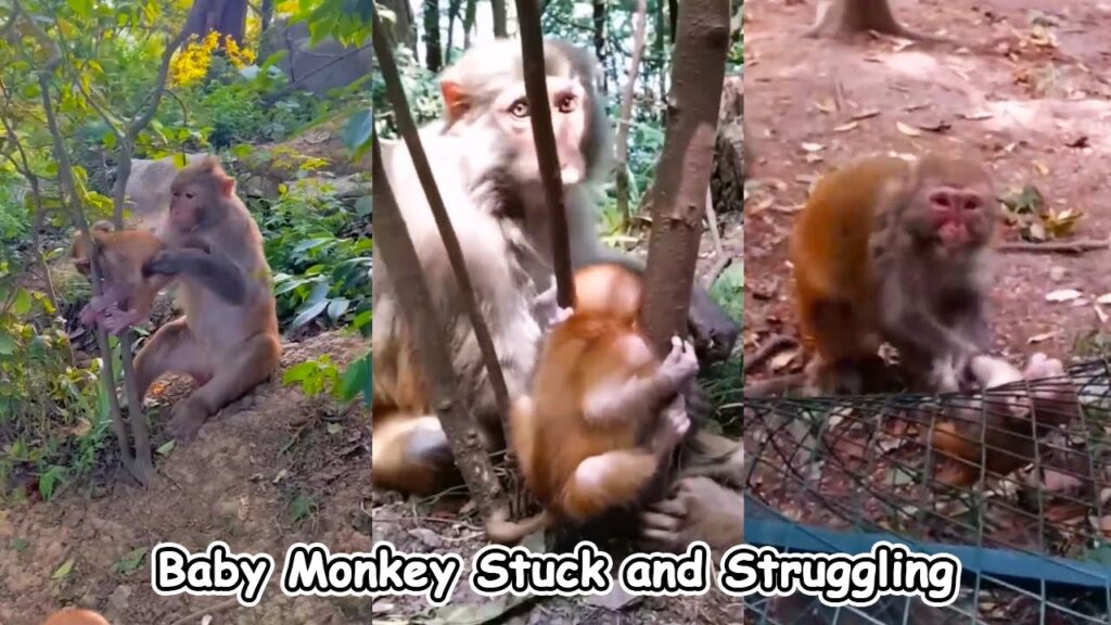 The poor baby monkey was stuck. The mother monkey tried helplessly to pull the baby monkey out, her movements frantic and desperate.
