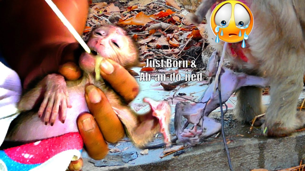 In this emotional wildlife clip, a tiny newborn baby monkey abandoned by its mother lies trembling on the ground moments after birth. Its small hands reach out instinctively, searching for warmth and protection. But the mother, confused or stressed, slowly moves away, leaving the helpless infant alone.