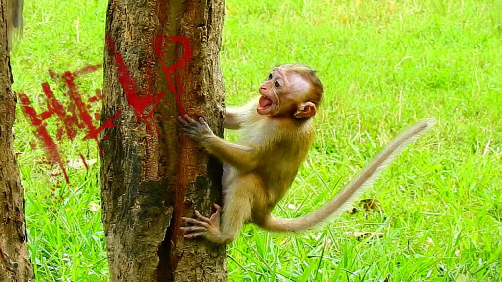 A tiny baby monkey, shaking uncontrollably, cries out into silence. No mother. No protection. Just fear.